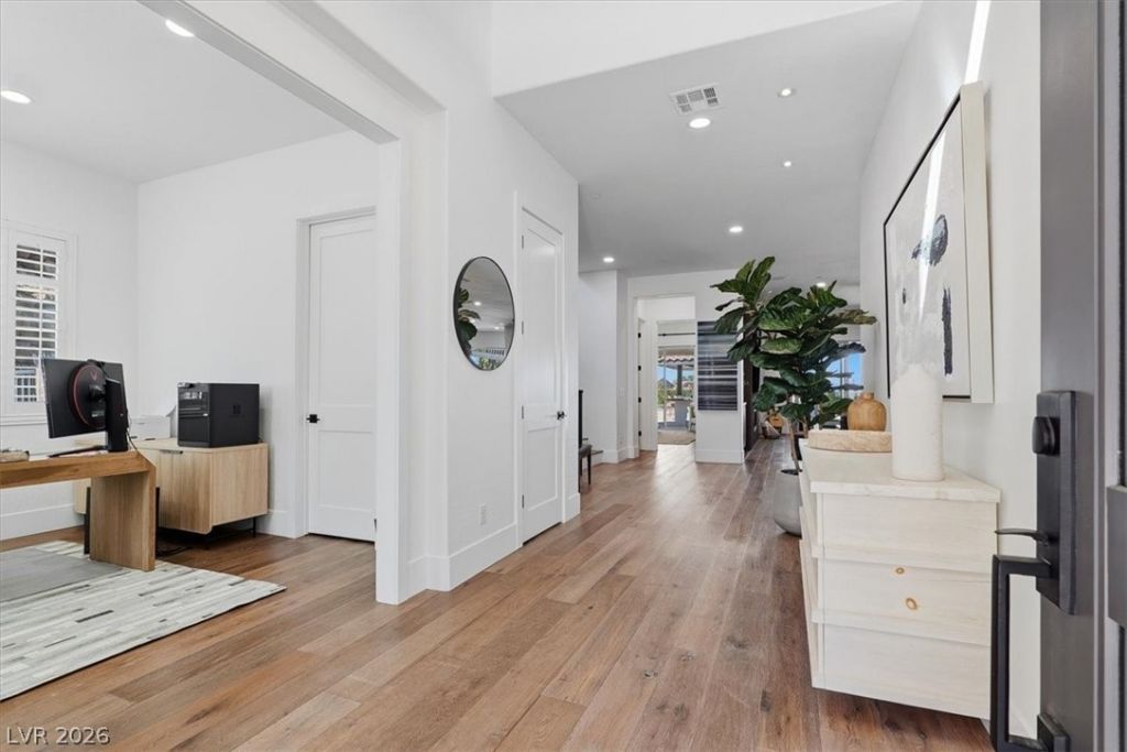 Tucked at the end of a private cul-de-sac within a gated Seven Hills community, this renovated estate FEATURES A RARE 8 CAR GARAGE CAPACITY and sits on the largest homesite in the neighborhood (.50 acres). Wide-plank hardwood floors, 8 baseboards, and a stone fireplace elevate the interior, while dual sliders create seamless indoor-outdoor living. The 2023 remodeled kitchen showcases a leathered quartzite waterfall island with new cooktop, dishwasher, sink, and hardware. All four full baths are beautifully renovated, including marble in the primary and quartzite in secondary baths. Upstairs offers sweeping city views, and large laundry. The property includes a 3-car attached plus oversized 5-car detached garage w/separate-access workshop. The resort-style backyard features a lagoon pool/spa, custom BBQ pavilion with seating for 20 & pellet grill, sunken fire pit, raised garden beds, half-court basketball w/shooting machine, & regulation pickleball court w/solar lighting.