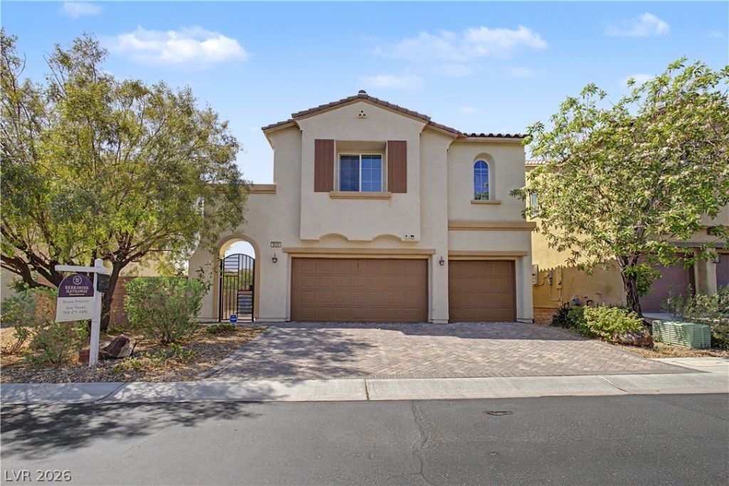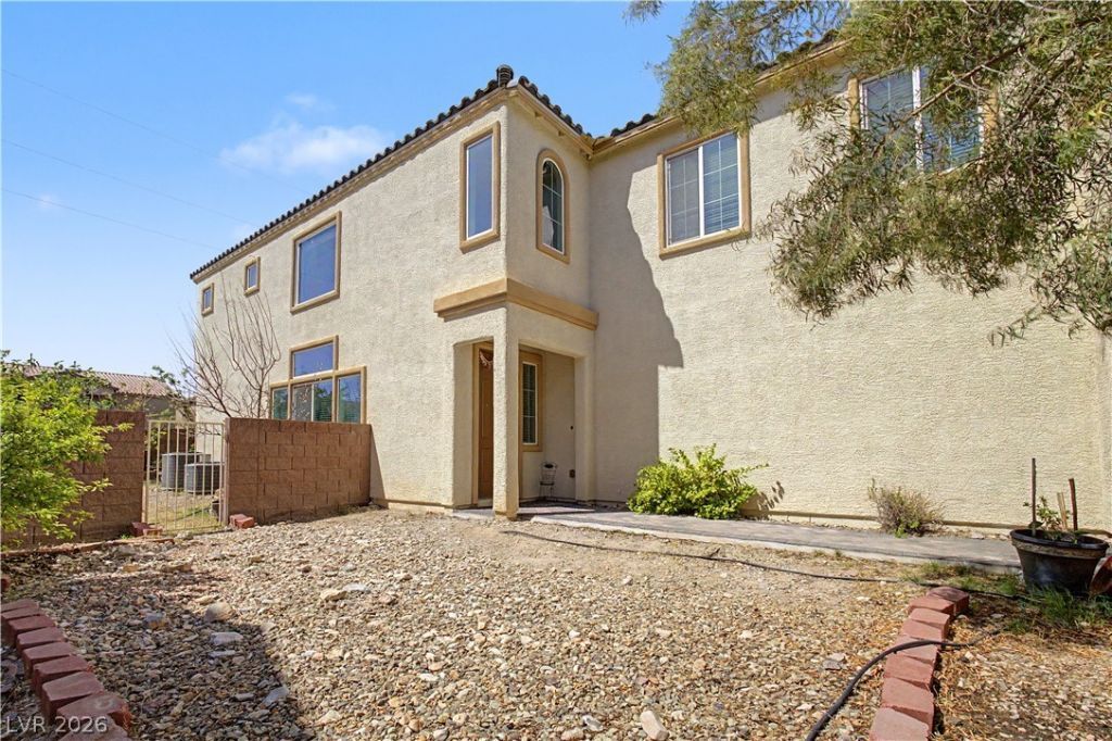 Stunning two-story home located in a gated community in the heart of Mountains Edge. This spacious property features 5 bedrooms, 2.75 baths, and a large primary suite with retreat. Flexible floor plan includes two lofts and a dedicated study area. Open-concept layout with a spacious living room adjacent to the kitchen, complete with recessed lighting, granite countertops, upgraded cabinetry, stainless steel appliances, and breakfast nook. Separate formal living and dining areas. Interior highlights include tile flooring, wrought iron staircase, window coverings, separate laundry room, soft water loop, and recently updated water softener. Washer & Dryer included. Exterior features include a paver driveway, custom wrought iron security door, enclosed courtyard with multiple fruit trees, and a serene backyard with gazebo. Community amenities include multiple parks, splash pads, and a volleyball court. Well-appointed and move-in ready home offering space, functionality, and convenience.